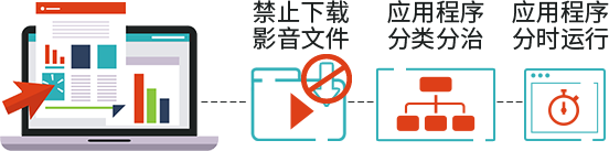 应用程序管控+网页浏览管控+网络流量管控,可对桌面行为进行严格的管控。