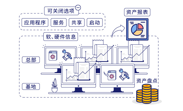 - 自动收集总部和各生产基地终端电脑的软硬件信息,并根据筛选条件导出对应的资产报表,详细了解终端资产情况