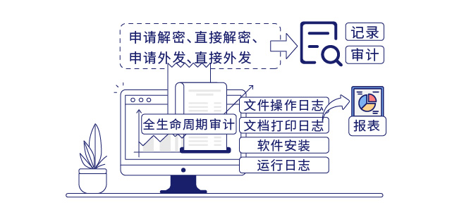 - 对员工电脑重要加密文件的操作行为进行记录和审计,包括文件申请解密、直接解密、申请外发、直接外发等