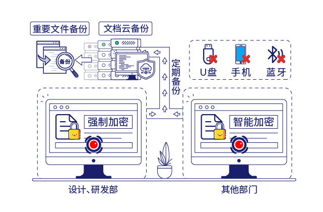 - 公司部署文档加密系统,针对设计、研发部门开启所有文件强制加密,其他部门开启重要文件智能加密,即使文件泄密出去也无法打开