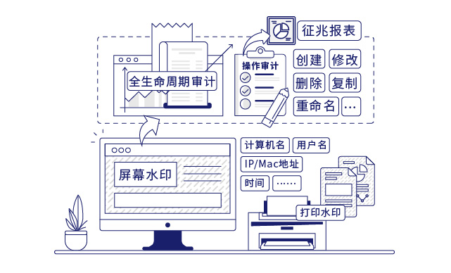 - 针对员工电脑文档操作行为进行全生命周期记录,记录文档创建、复制、修改、删除、重命名、移动、上传等行为,并生成征兆报表,以便审计部门及时审查出员工的违规行为