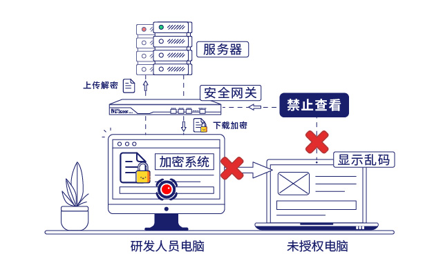 - 公司服务器前部署安全网关,非法设备访问服务器会被安全网关拦截,同时文件上传到服务器自动解密,从服务器拿取文件到本地会自动加密