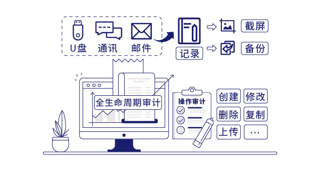 - 记录员工电脑U盘拷贝、IM聊天工具外传、邮件发送等行为,备份其拷贝和外传的文档,同时记录其操作时的屏幕画面,增加审计的有效性