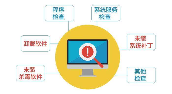 管理员可以提前对计算机组或者单一计算机增加各项安全检测条件,包括杀毒软件检查、软件安装检查、程序检查、系统服务检查、系统补丁检查以及其他检查。