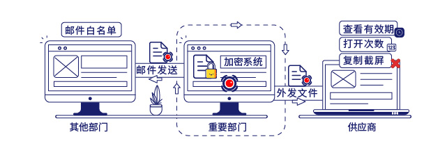- 重要文件发给供应商或公司其他部门,对供应商采用外发文件的形式,设置文件打开次数和有效期防止二次泄密,公司其他部门采用邮件白名单方式解密