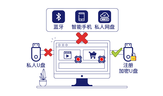 - 禁止员工将智能手机、蓝牙等设备接入公司电脑,同时分发公司U盘,禁止个人U盘接入,只允许认证过的公司U盘接入电脑