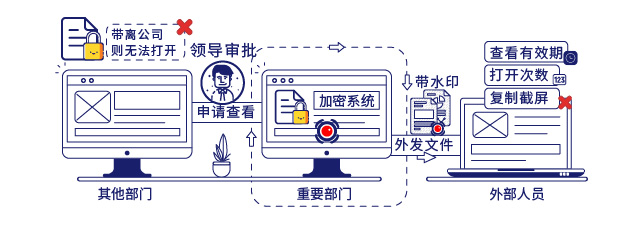 - 重要文件发给其他部门查看则需要领导批准,发给外部人员需要制作成外发文件,限制文件打开次数和打开时间,且添加水印和文档密码防止外部泄密