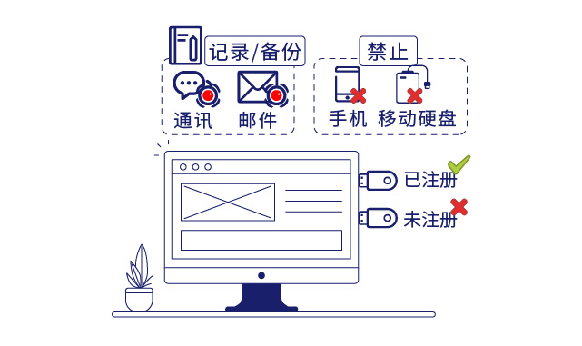 - 员工需要使用U盘传输文件,担心员工将文件随意拷贝到私人U盘、移动硬盘或手机带走,需要管控U盘、移动硬盘以及智能手机