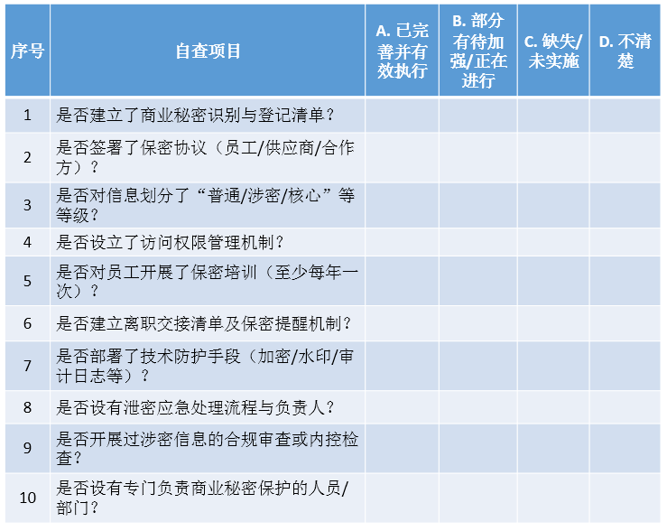 商业秘密保护自查表,是否完善并有效执行保密措施?