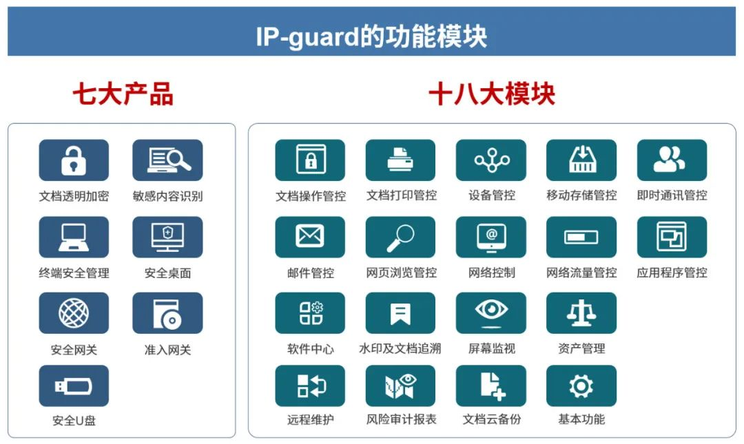溢信科技自主研发的终端安全管理系统IP-guard,是一款功能强大的一体化终端安全管理软件,拥有七大产品十八大模块功能,可实现信息防泄露、文档加密、上网行为管理、桌面行为管理、系统管理、资产运维等安全管理,满足企业不同内网环境的不同应用需求。